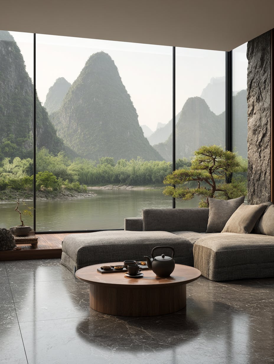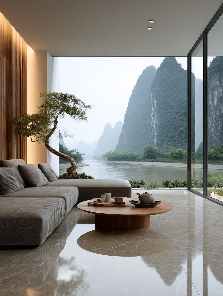 Modern luxury living room, floor-to-ceiling glass wall with breathtaking view of misty karst mountains and calm river, minimalist interior design, neutral color palette, clean lines, sleek gray sectional sofa without blanket, round wooden coffee table with ceramic tea set, bonsai tree as indoor decor, polished marble flooring, warm natural lighting, serene and spacious atmosphere, contemporary architecture blending with nature, high-end modern style, no clutter, calm and balanced composition, ultra high-definition details, soft ambient tones, sophisticated and elegant design