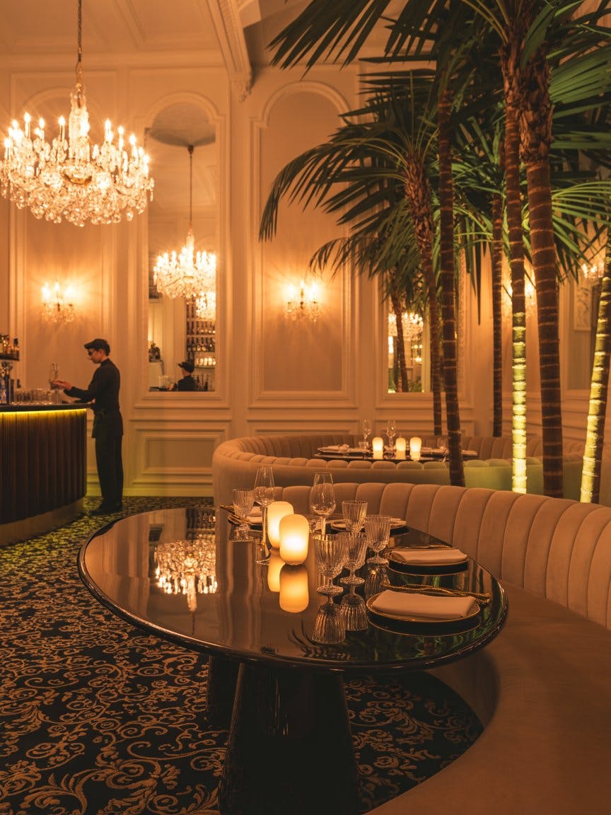 Elegant modern interior with cherry blossom trees indoors and curved arch architecture