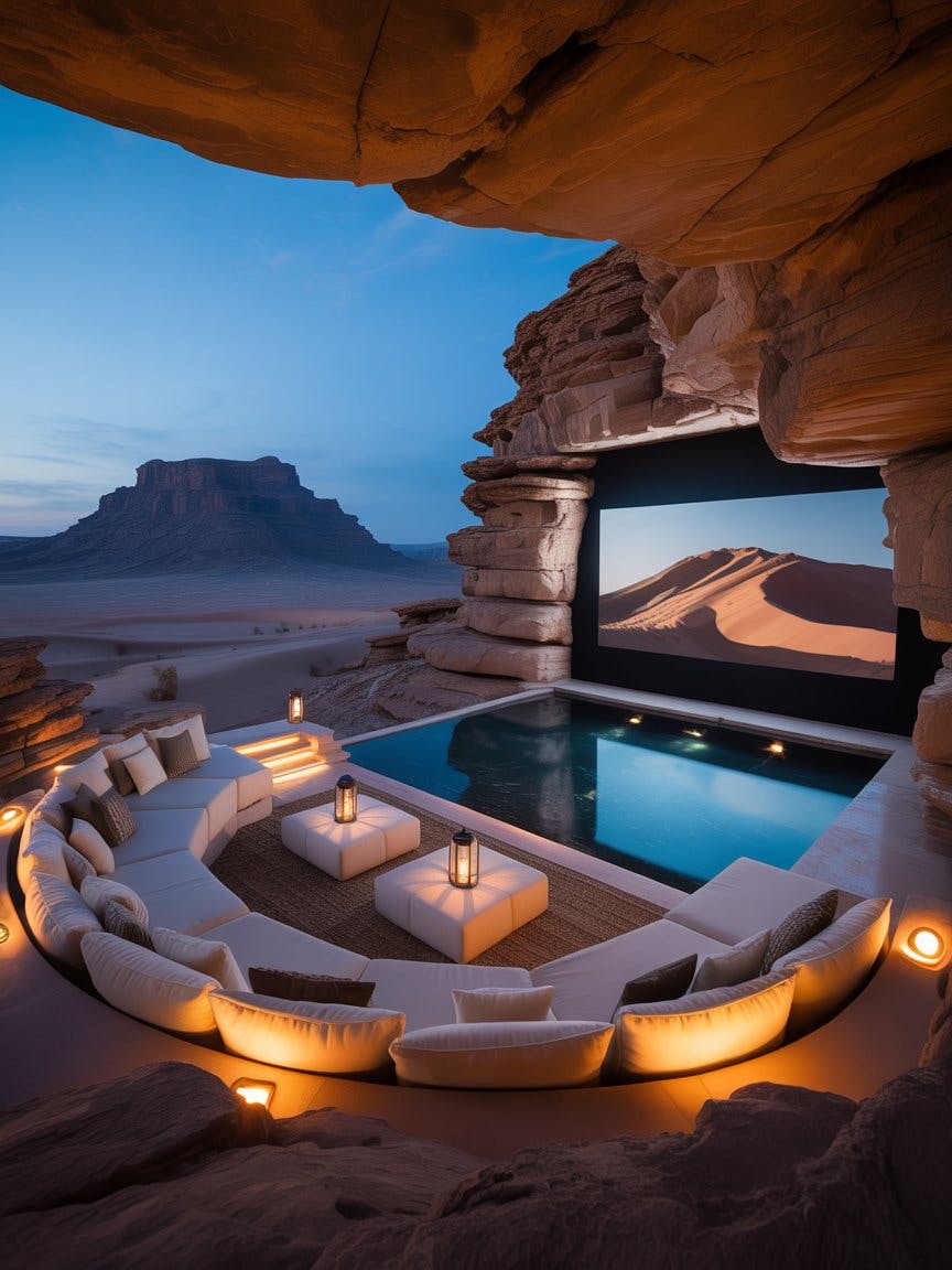 Desert cave cinema, luxury outdoor home theater carved into sandstone cliffs