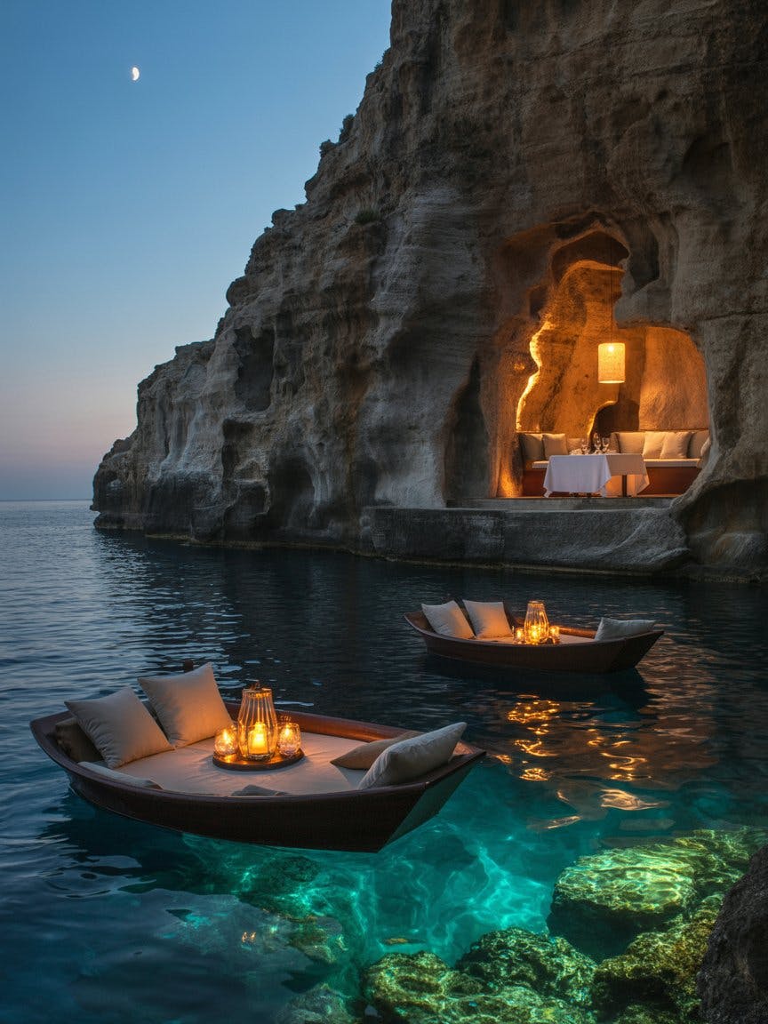 Luxurious cave restaurant by the sea with floating round boats and glowing candlelights