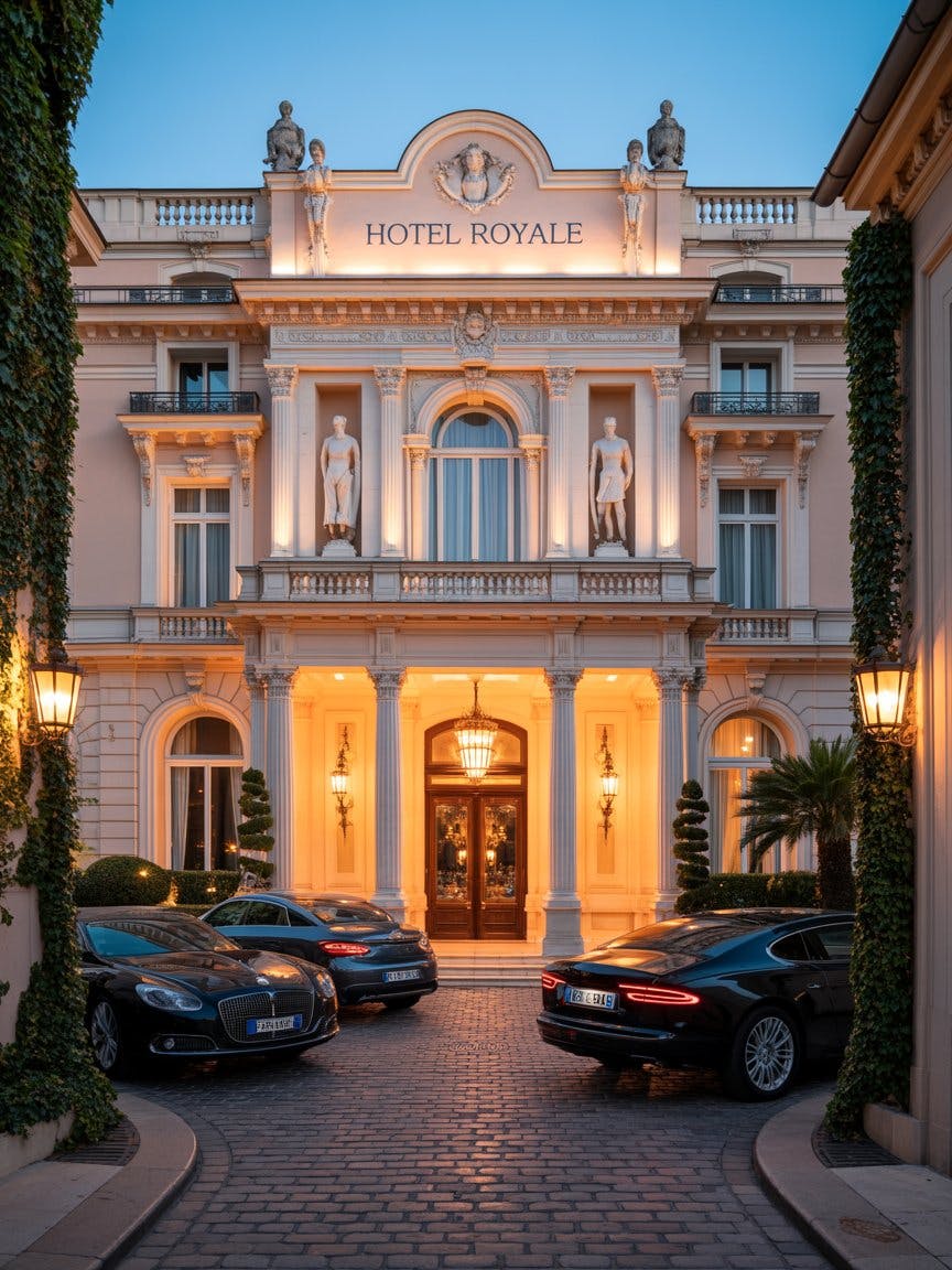 Luxurious European palace hotel with grand classical architecture with luxury cars