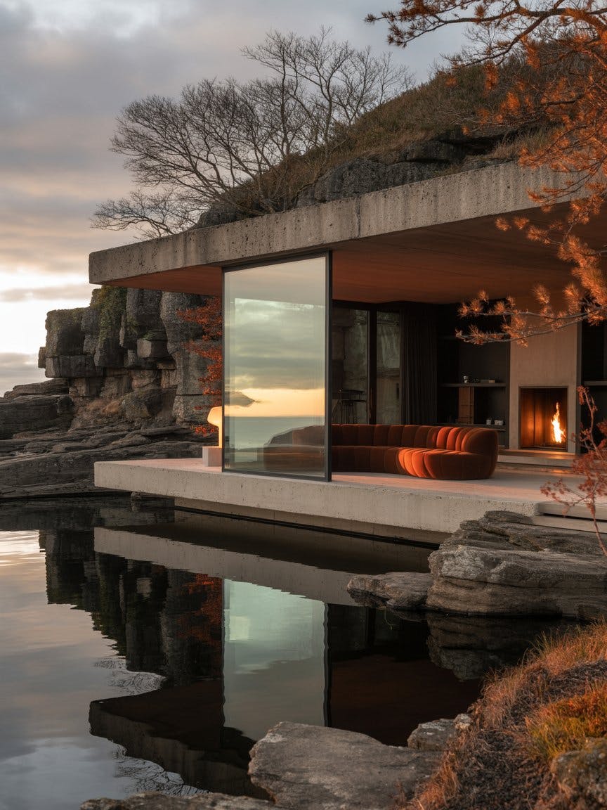 Brutalist cliffside retreat in rocky terrain with a velvet sofa and open fireplace