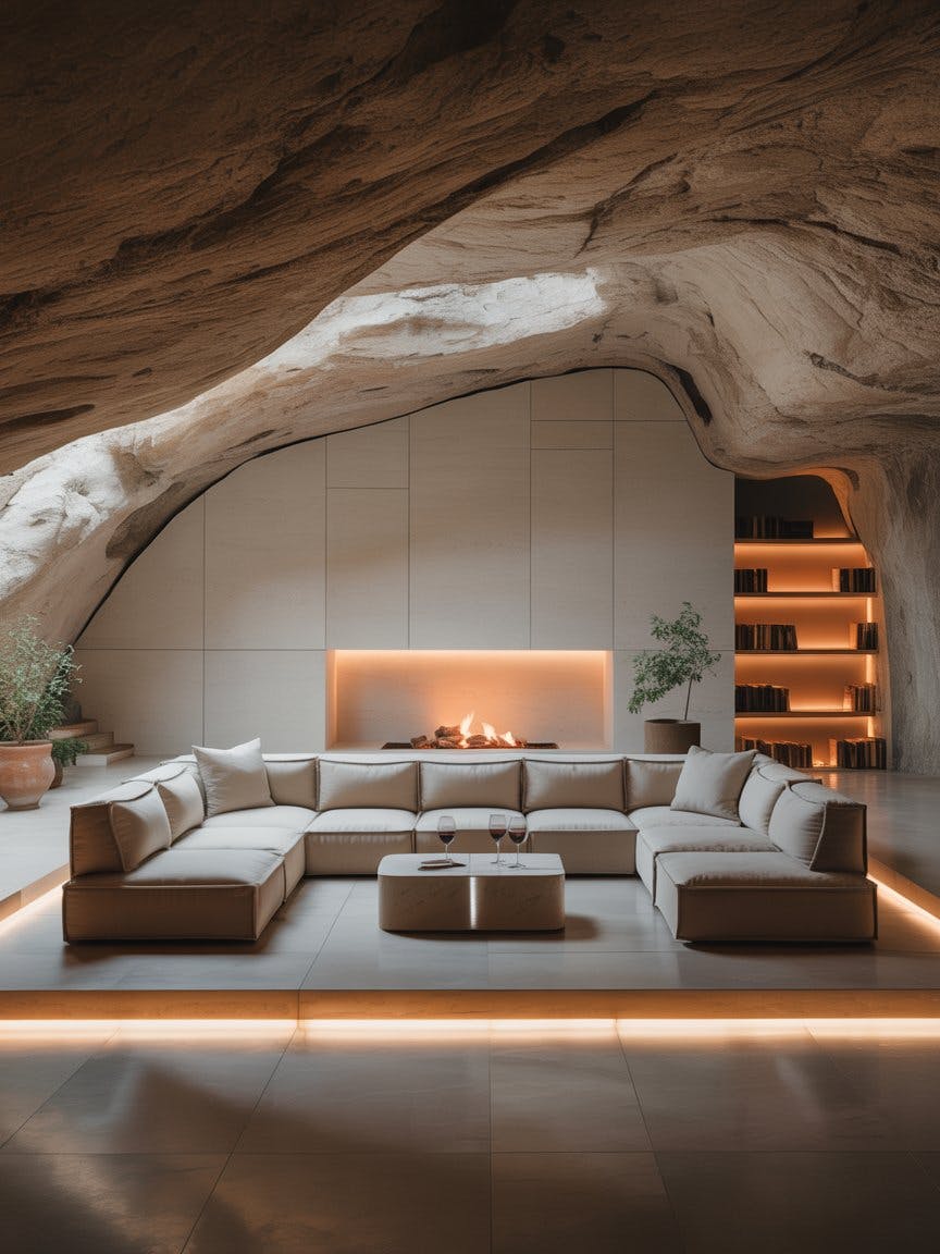 Minimalist living room built into a natural rock formation with contemporary coffee table