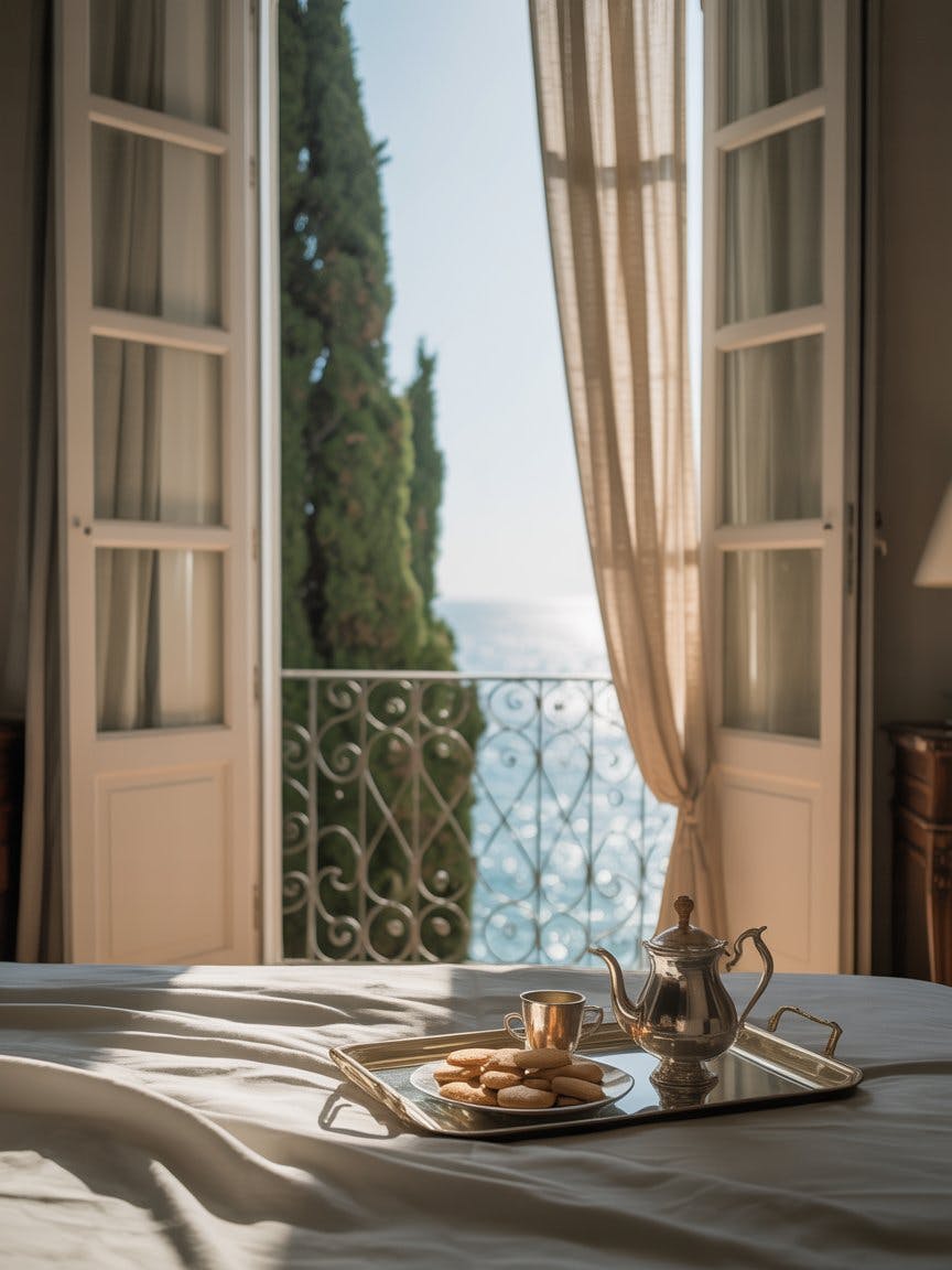 Silver tea set and cookies on a breakfast tray in a Mediterranean coastal villa