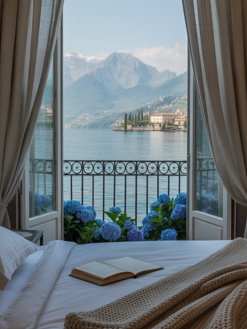 A quiet lake-view study with curved arched window with serene mountain-lake landscape