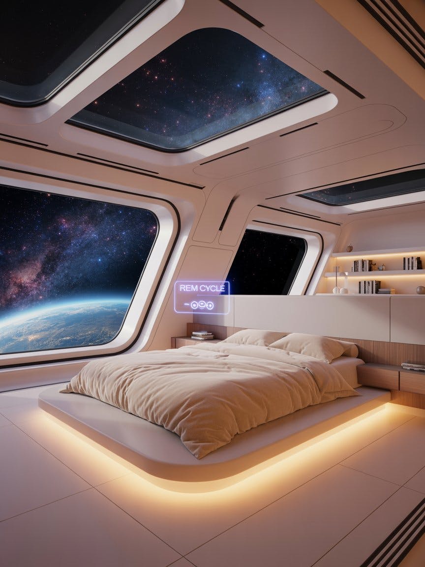 Futuristic luxury bedroom inside a space station with advanced smart home features