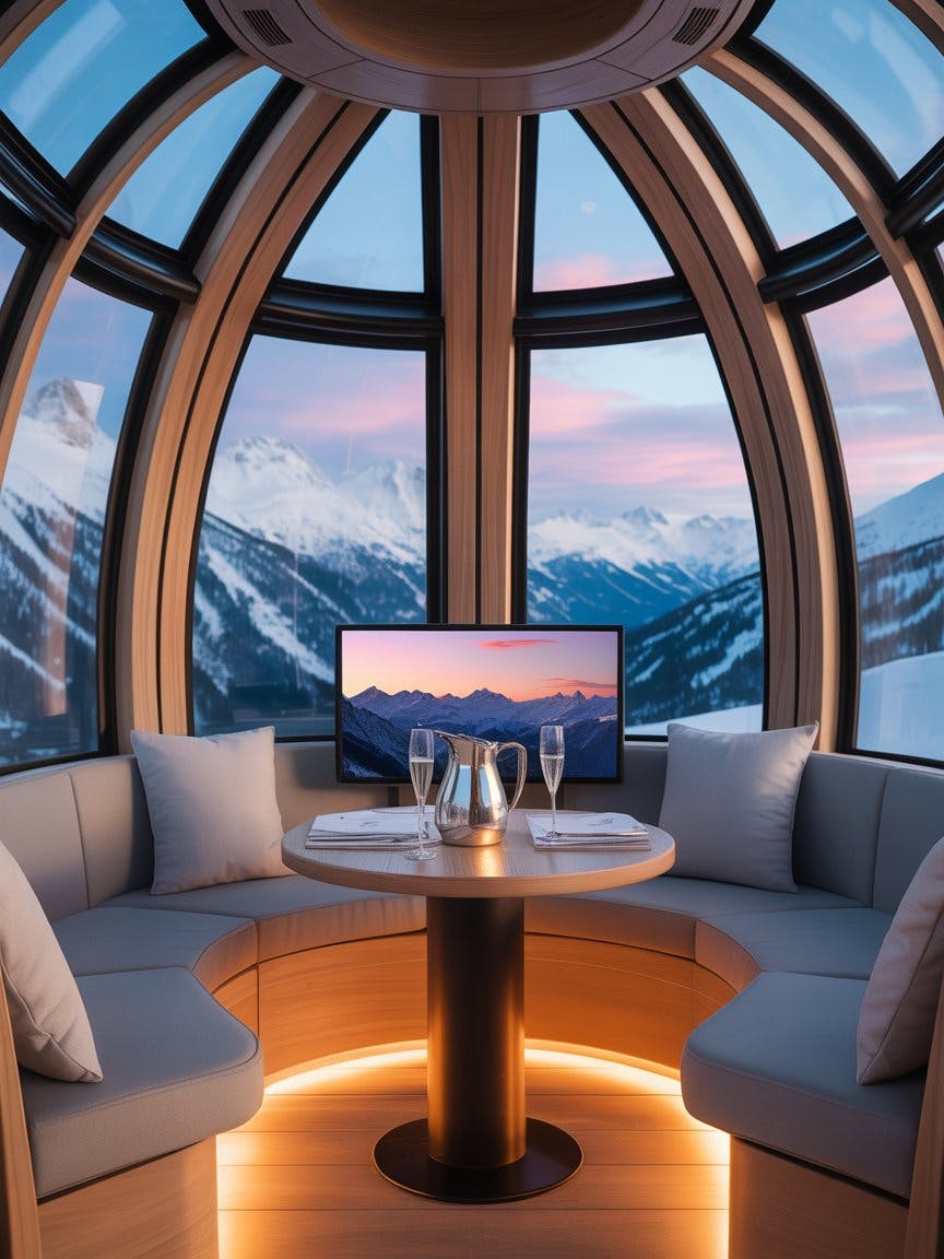 Luxury alpine gondola cabin interior with panoramic glass windows and cozy minimalist seating