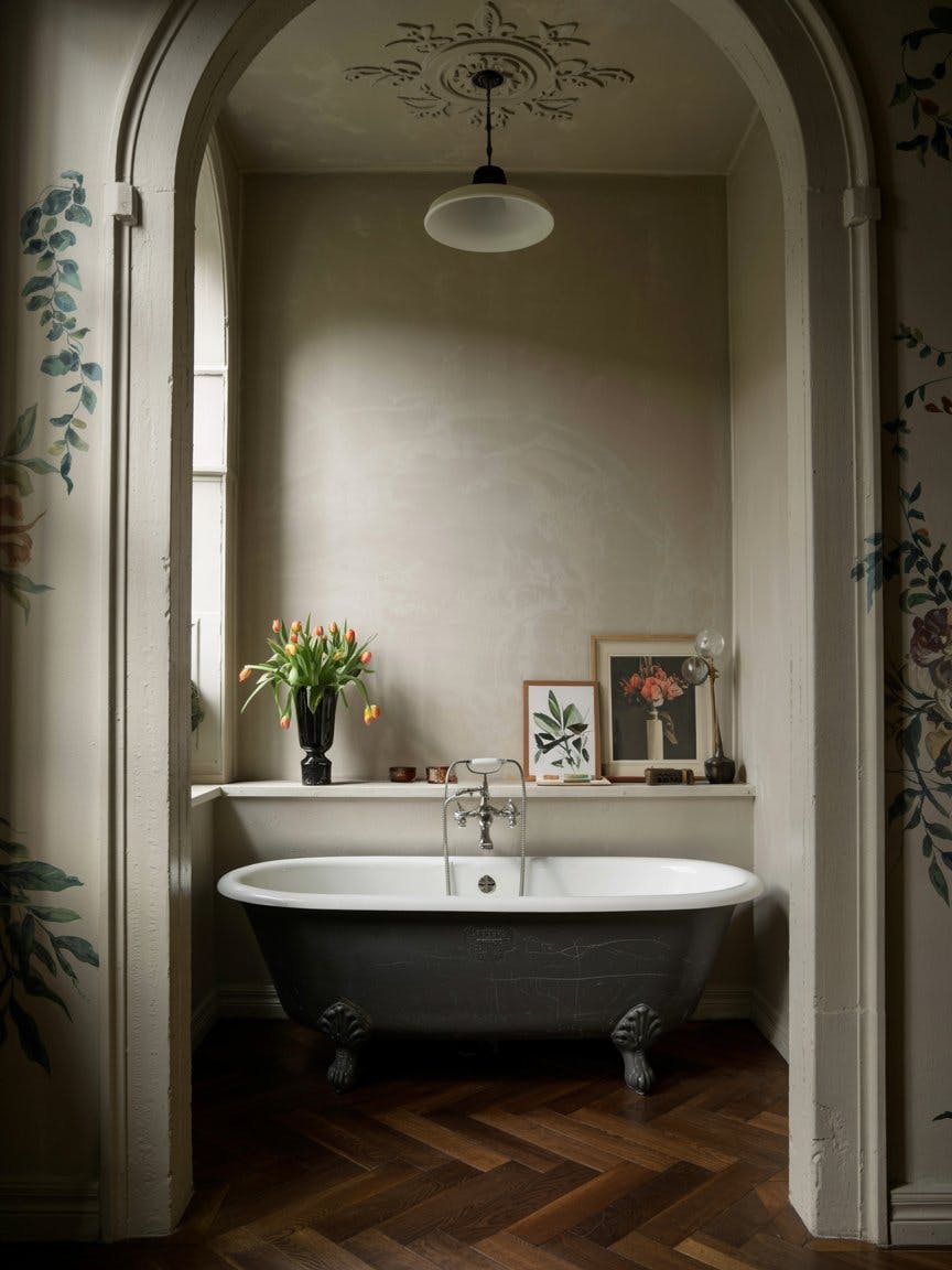 Vintage clawfoot bathtub with neoclassical columns and botanical artwork
