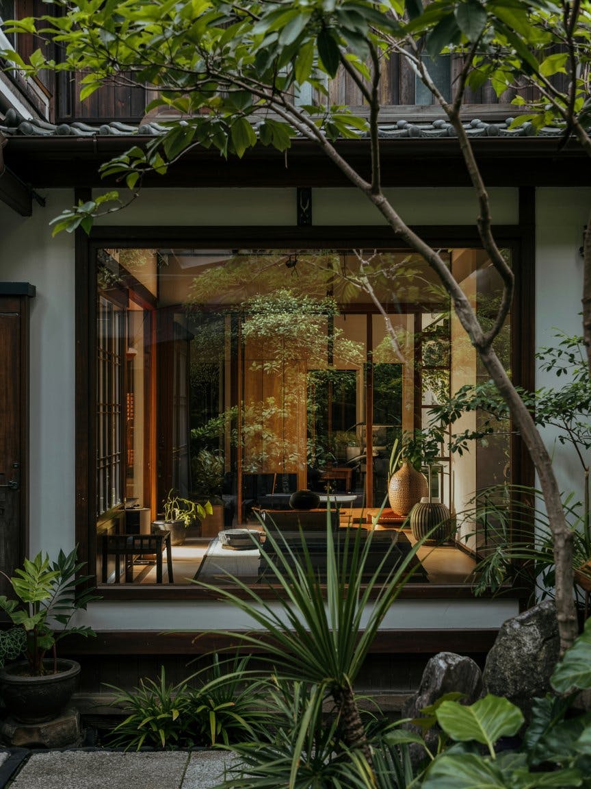 Traditional courtyard with lush green indoor garden and zen atmosphere