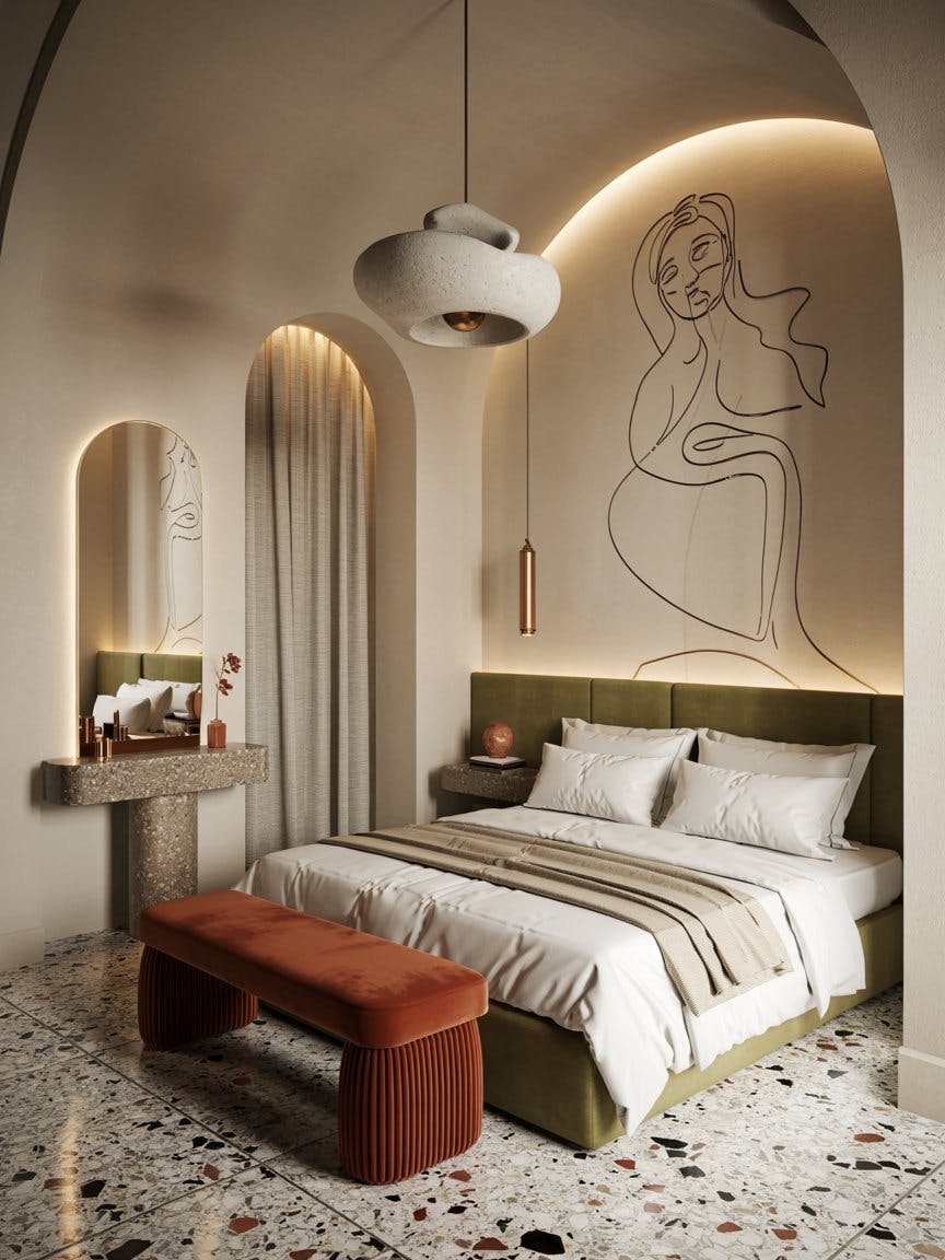 Elegant Mediterranean bedroom with vaulted ceiling with modern line art