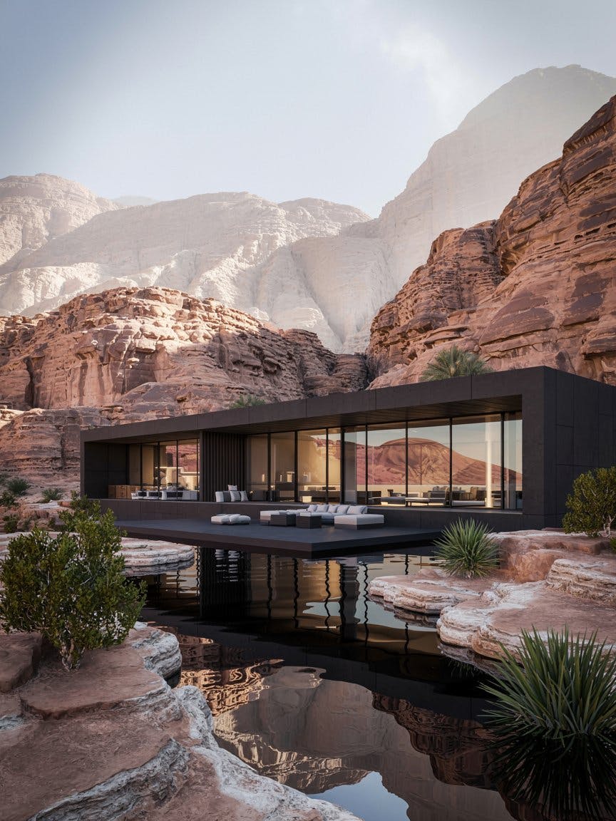 Minimalistic black villa embedded in desert cliffs with sharp geometric lines