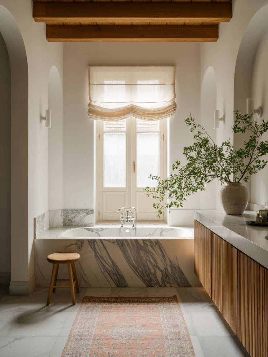 Scandinavian and Mediterranean minimalist bathroom with soft lighting