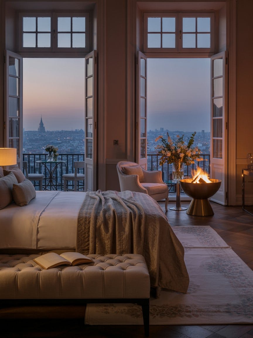 European-style bedroom interior with a scenic evening city view and plush king-size bed