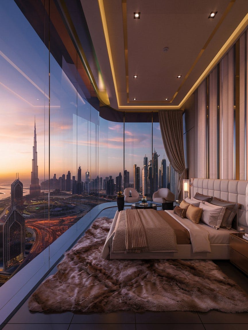 Ultra-luxury modern bedroom in a high-rise skyscraper showcasing a city skyline