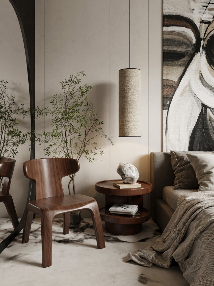 Modern bedroom corner with sculptural wooden side chair with curved back