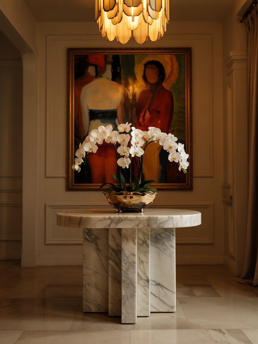 Grand architectural bedroom interior with tall stone columns and marble-textured walls