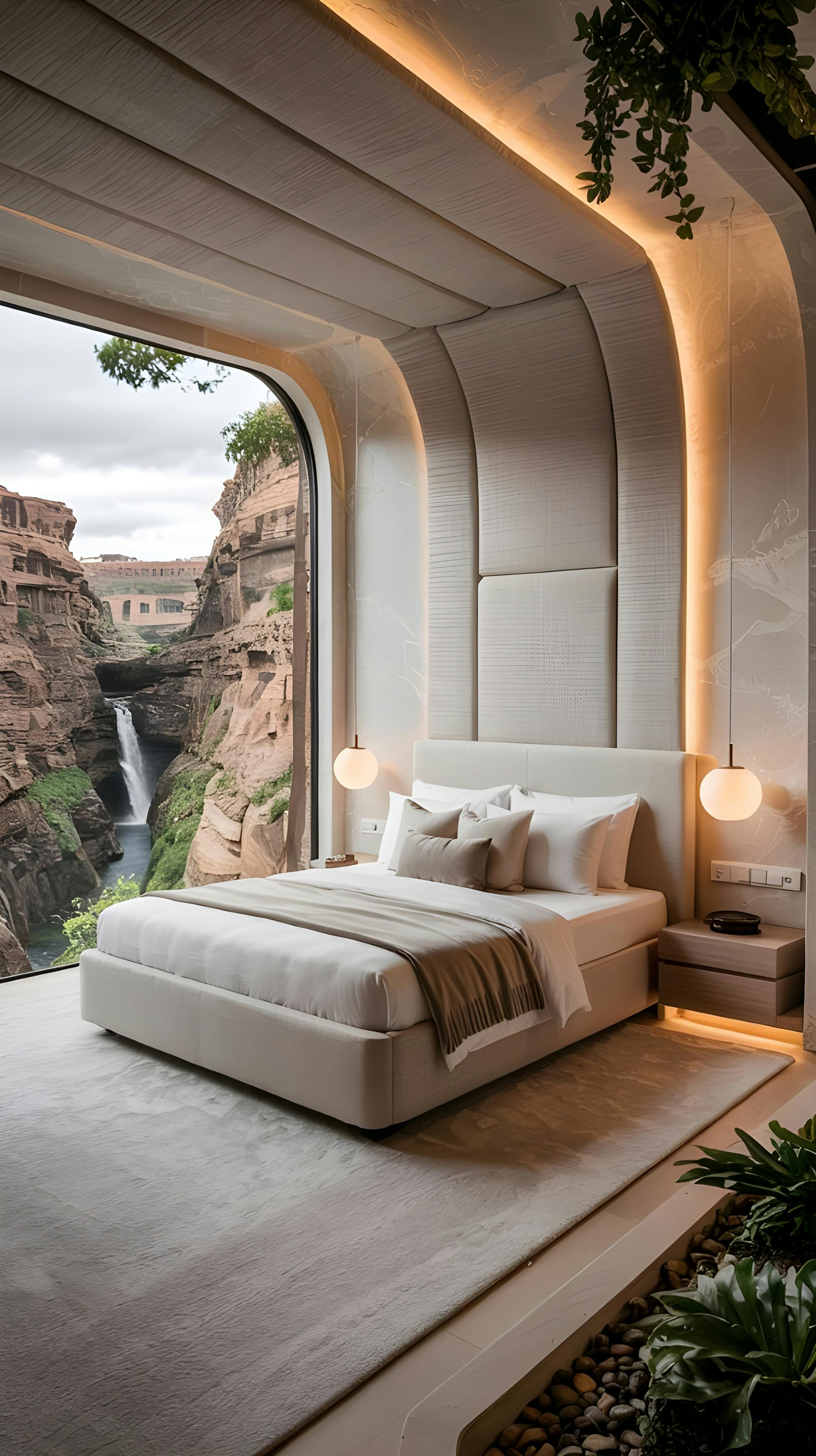 Elegant cliffside master bedroom with panoramic canyon views in beige and taupe