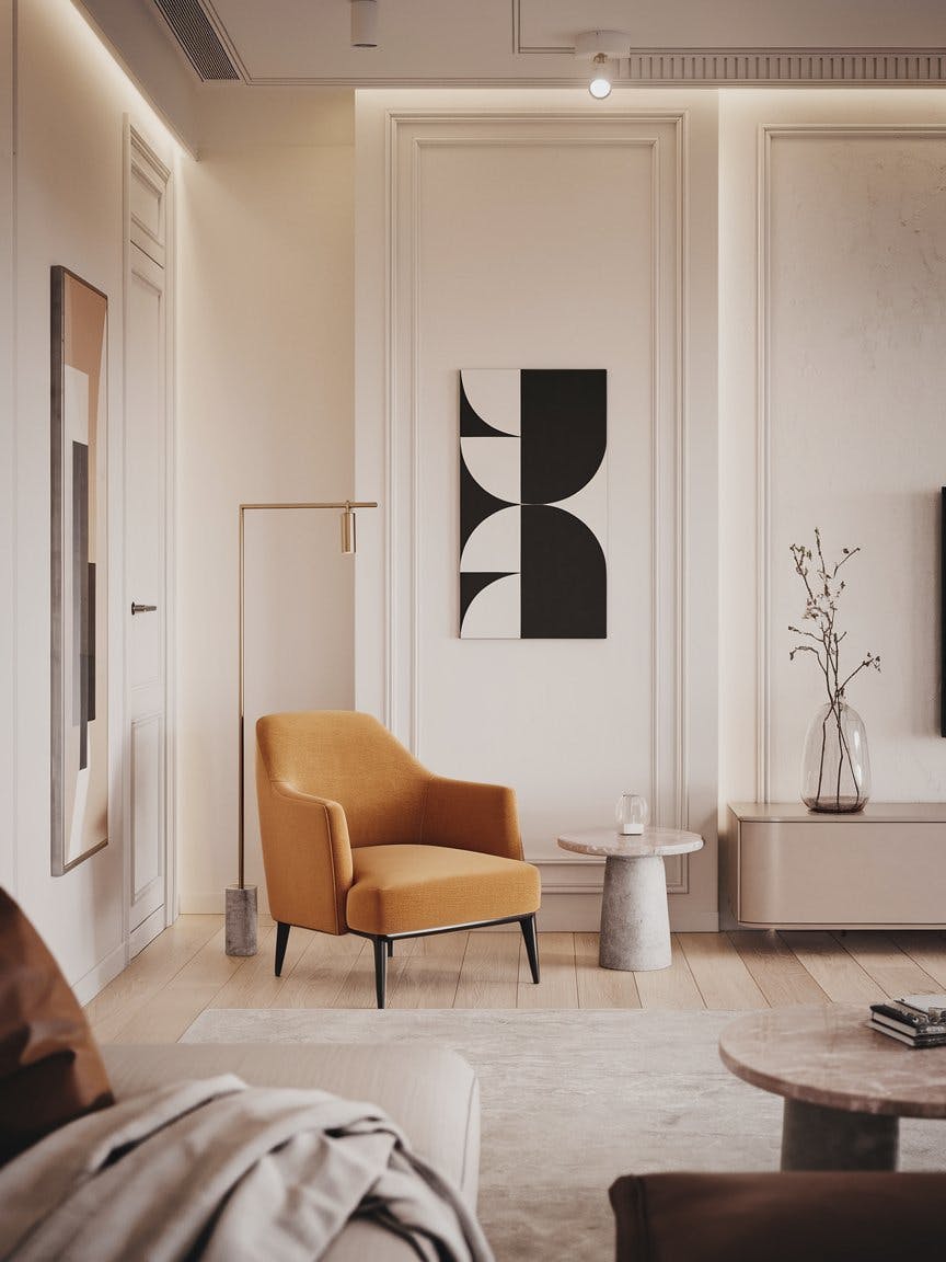 Modern minimalist living room with mustard beige armchair and abstract geometric wall art