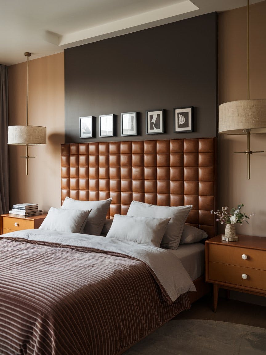 Modern bedroom interior with tall tufted brown leather headboard and gray wall