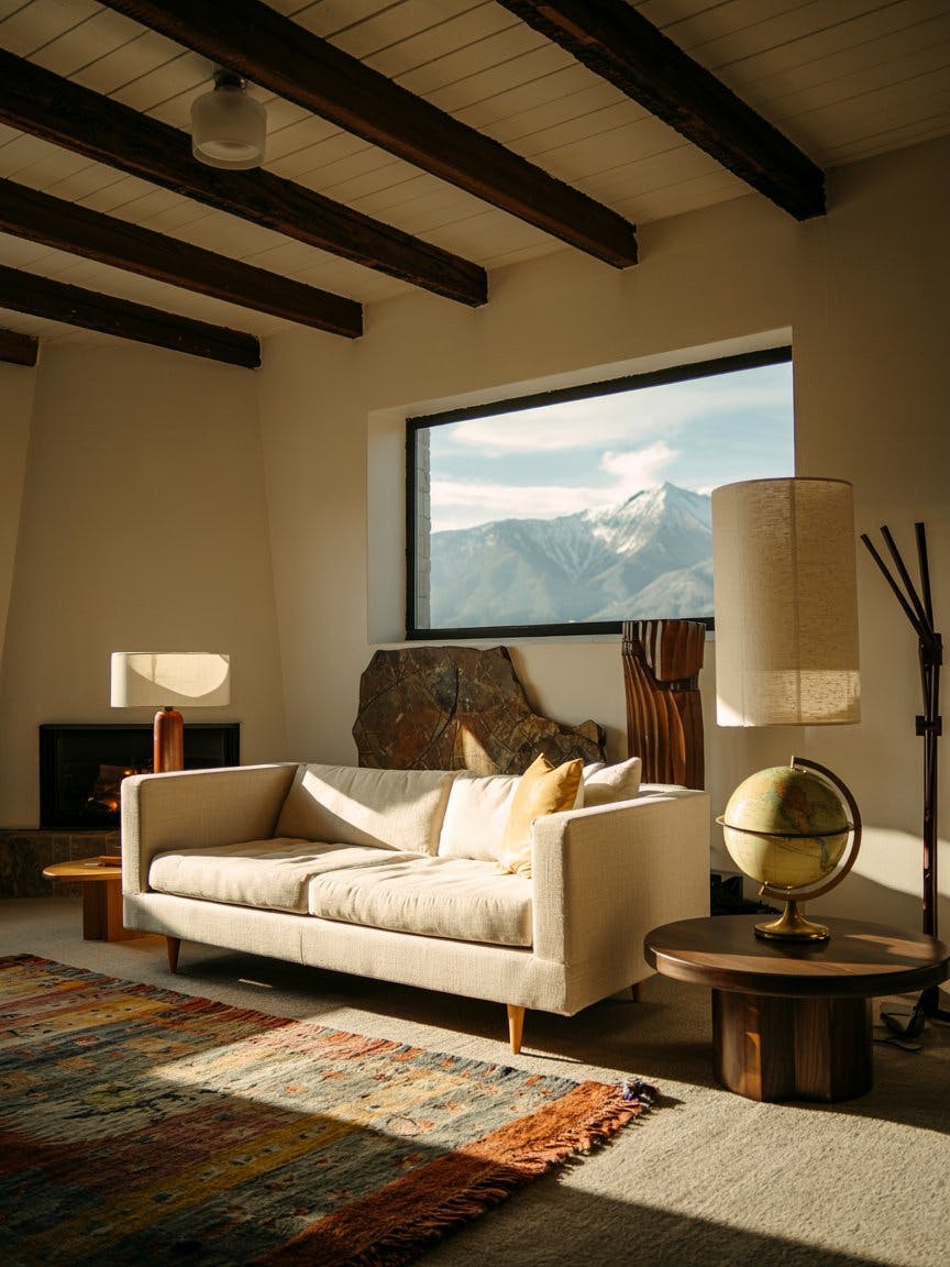 Mid-century modern living room with neutral earth tones and scenic mountain view