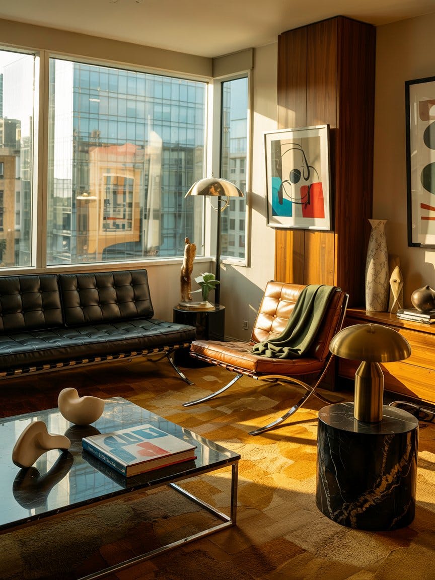 Mid-century modern interior, carpet, sleek leather Barcelona daybed in black