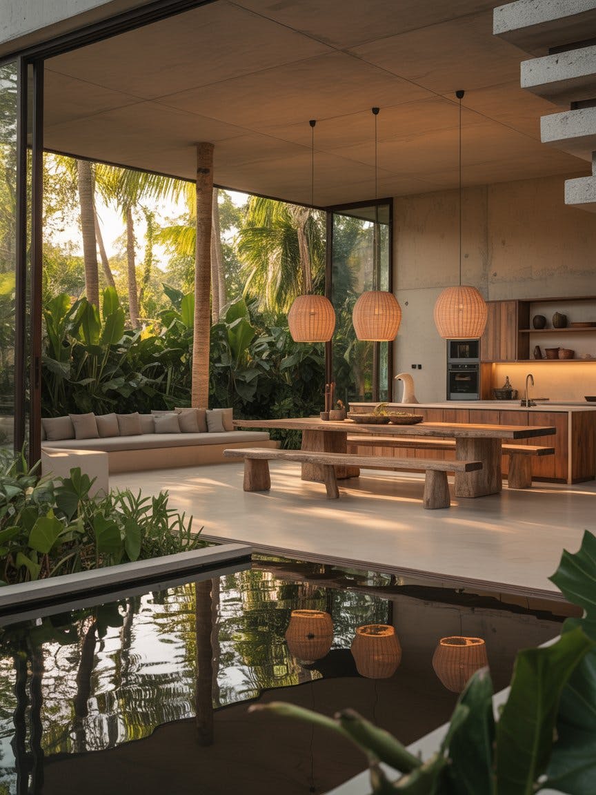Tropical modern interior with open-plan kitchen and dining area with sunken seating