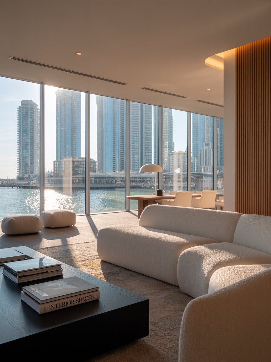 Modern luxury apartment interior with panoramic windows and plush curved white sectional sofa