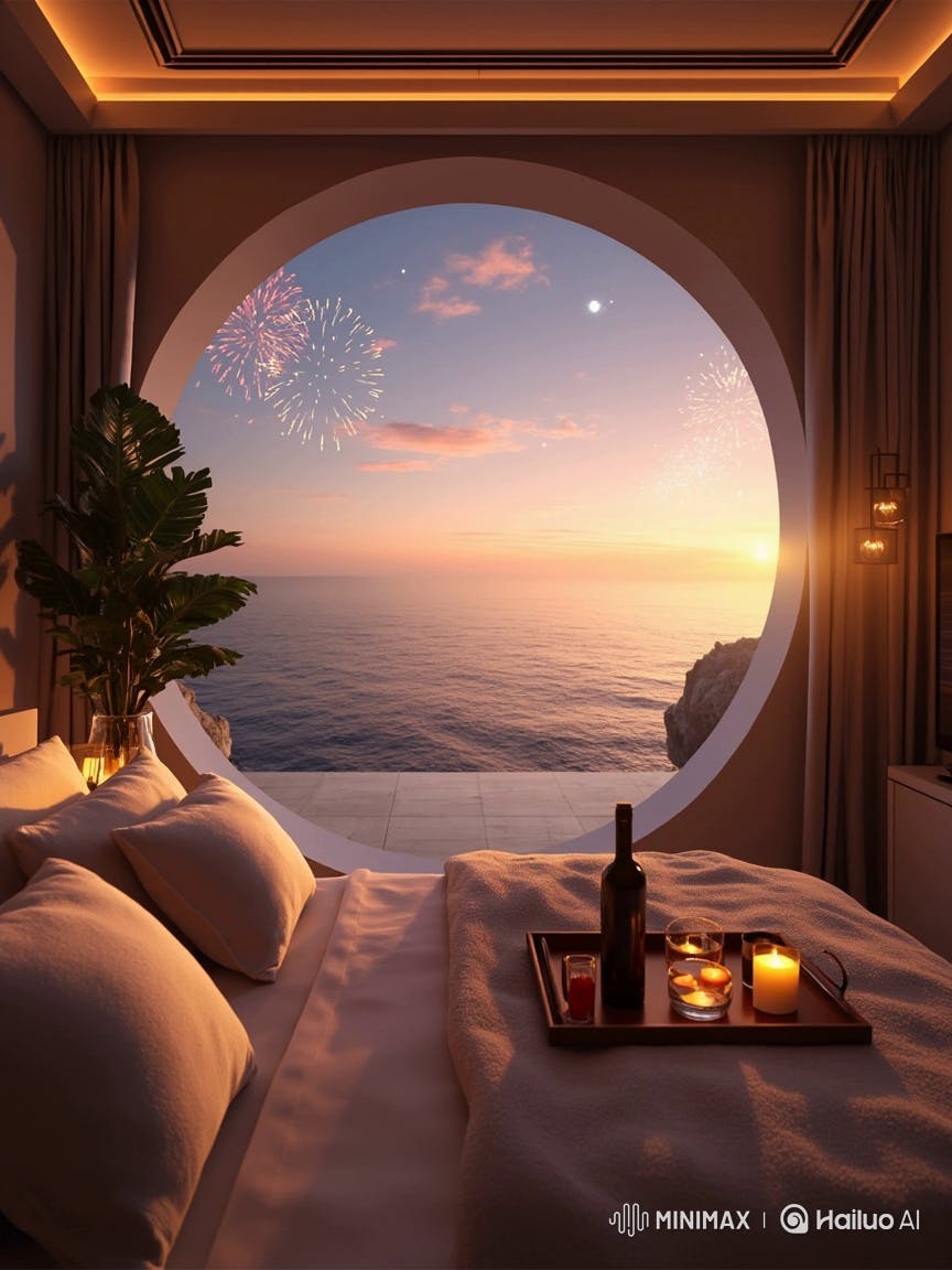 Romantic oceanfront bedroom with large circular window framing a calm sea