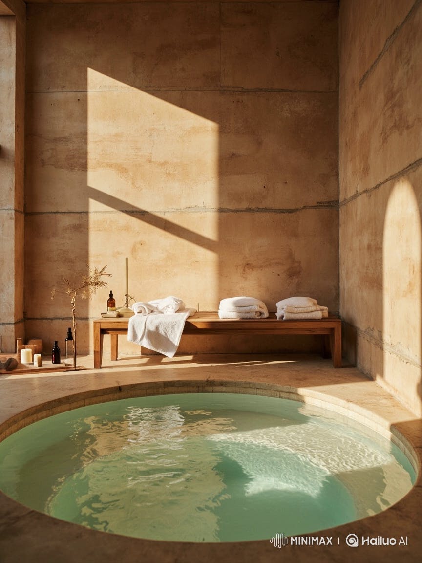 Luxury spa interior with sunken round jacuzzi and textured sandstone walls