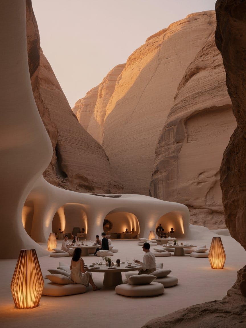 Futuristic desert restaurant in tall sandstone canyon cliffs with glowing lights