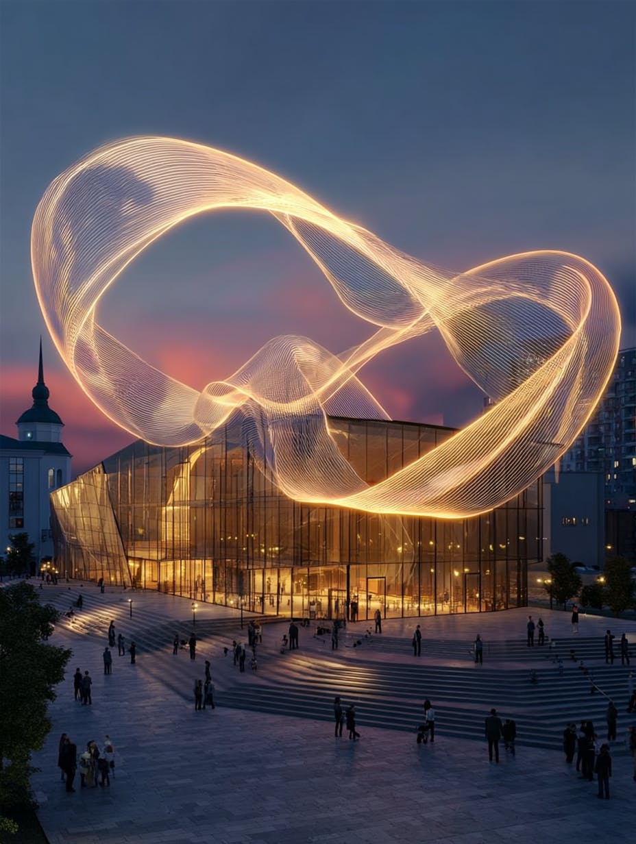 Futuristic architecture with glowing ribbon structure above a modern glass building