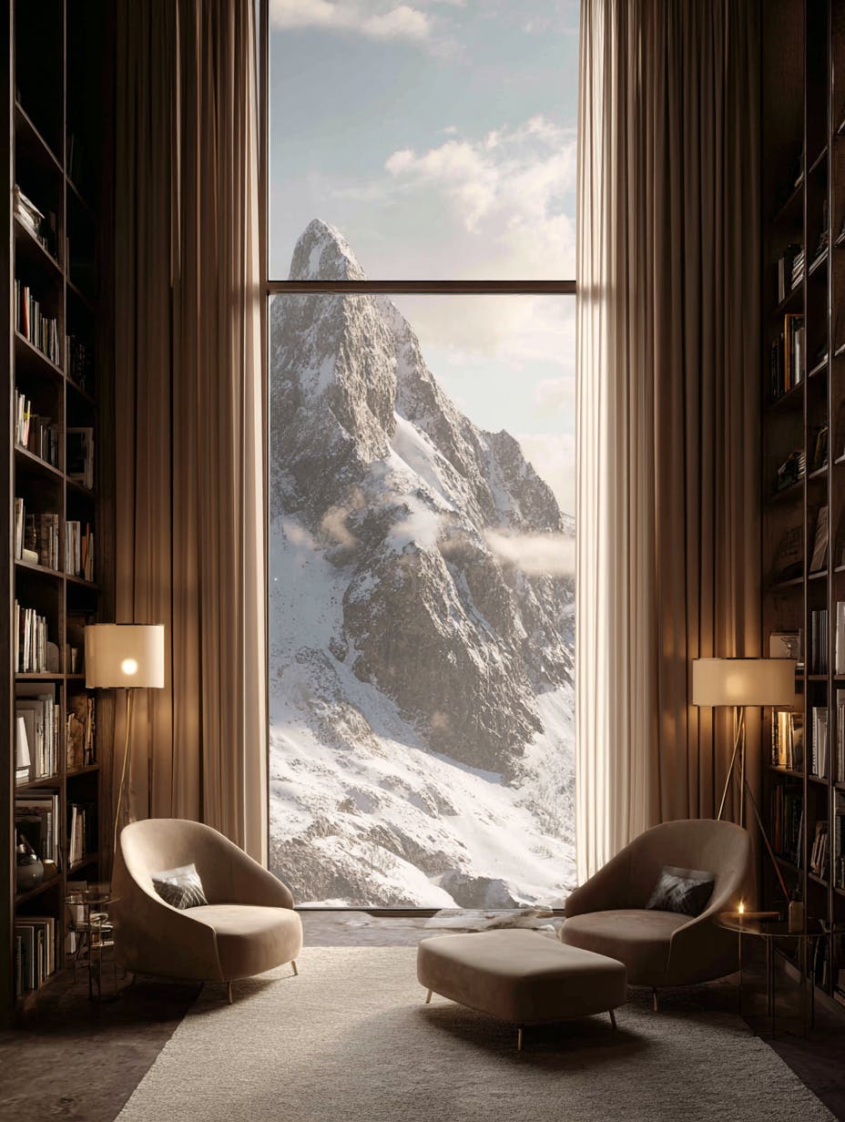 Luxury reading room with floor-to-ceiling beige curtains and modern armchairs