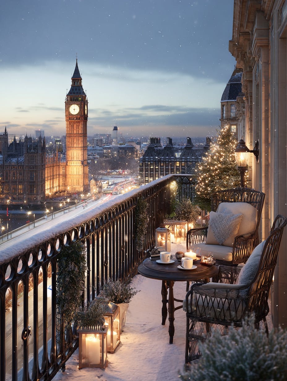 A balcony overlooking Big Ben in the Christmas winter evening in London
