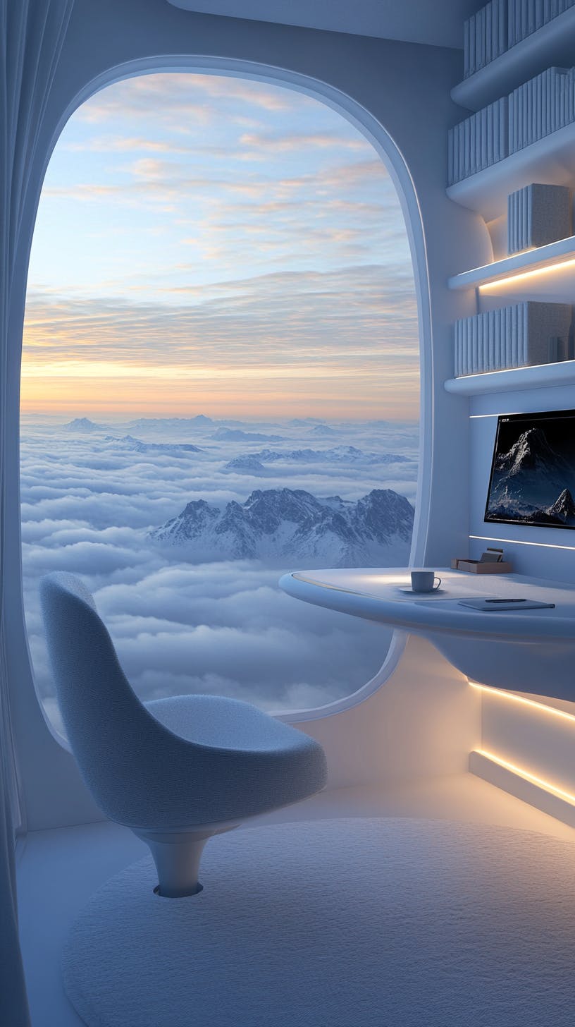 Futuristic workspace inside a luxury capsule loft above the clouds