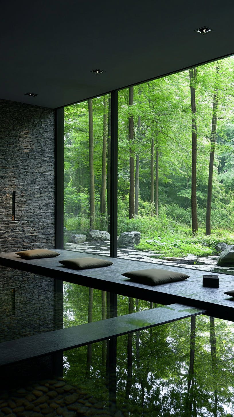 Tranquil meditation room with open space with dark textured stone walls and forest view
