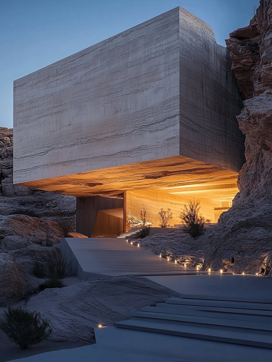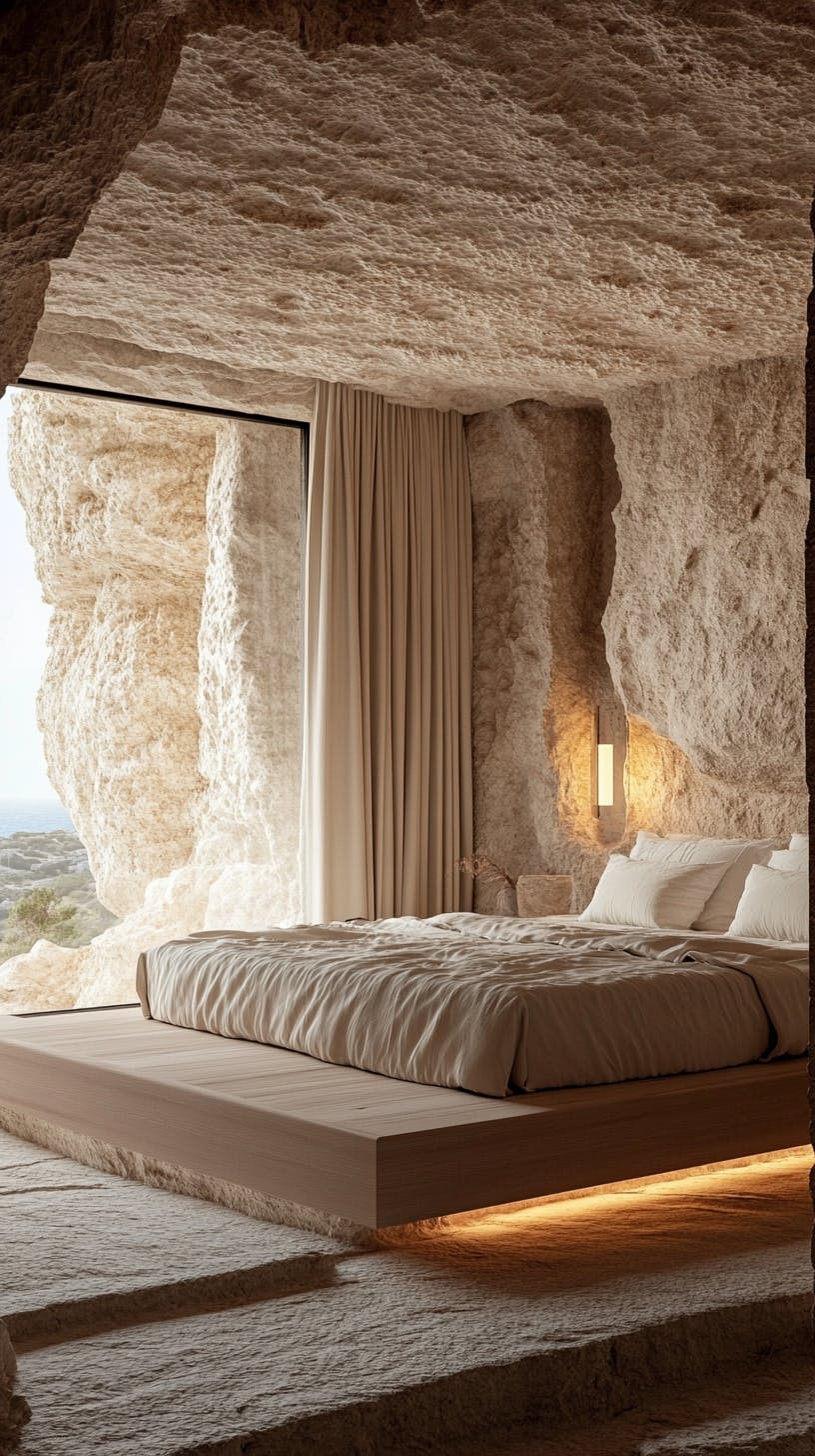 High-end bedroom carved into stone with a minimalist king bed