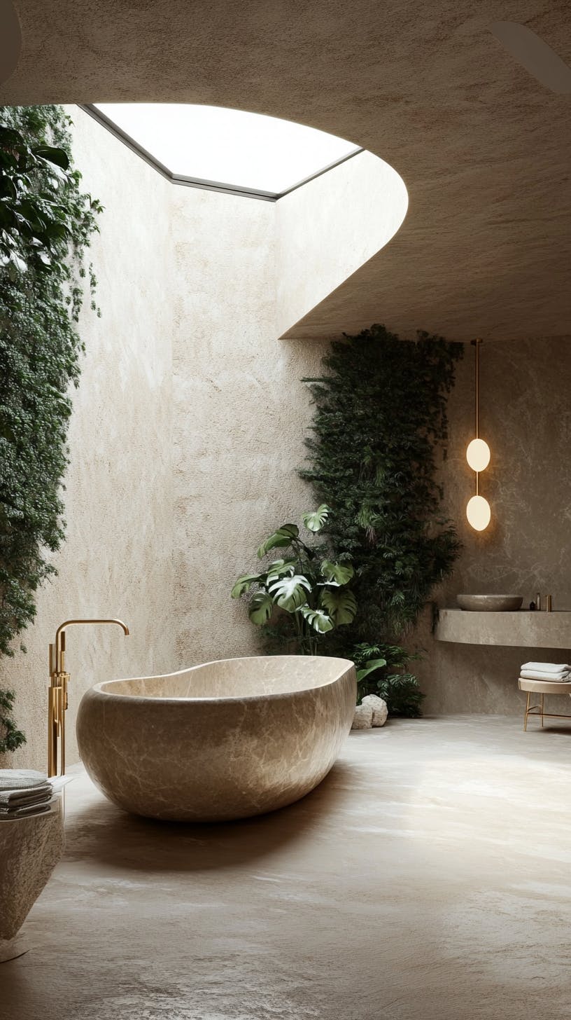 Zen spa-like bathroom with a freestanding stone tub beside a private green wall