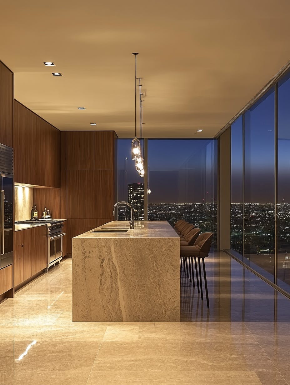 Modern minimalist kitchen interior with soft beige marble island and wooden cabinetry