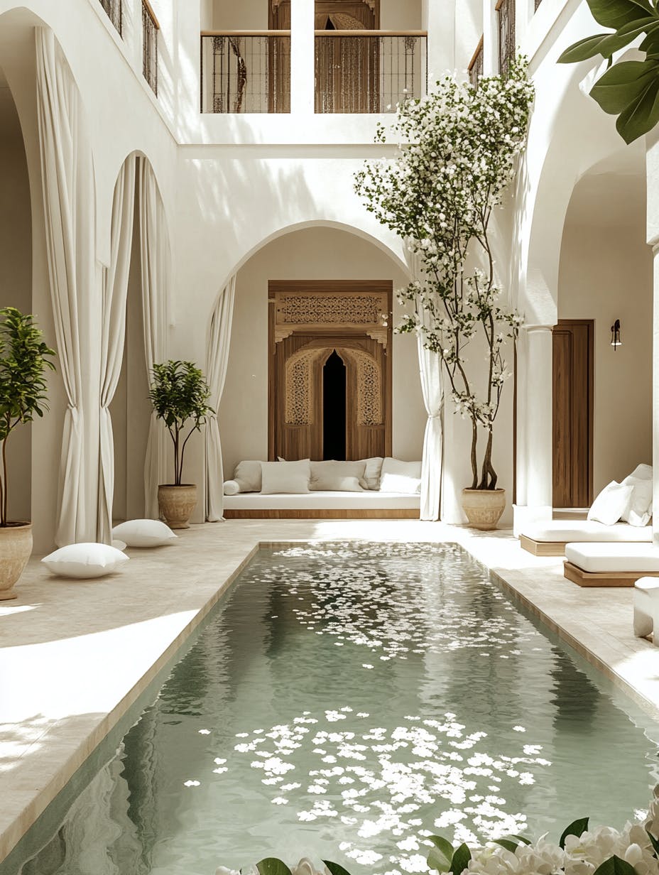 Luxury Moroccan courtyard with central reflecting pool and floating white flower petals