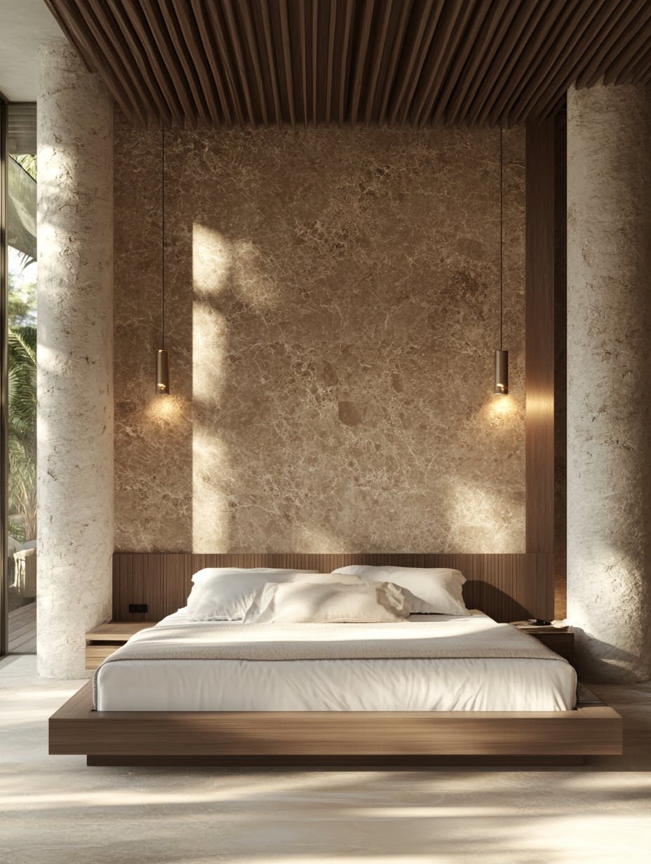 Grand architectural bedroom interior with tall stone columns and marble-textured walls