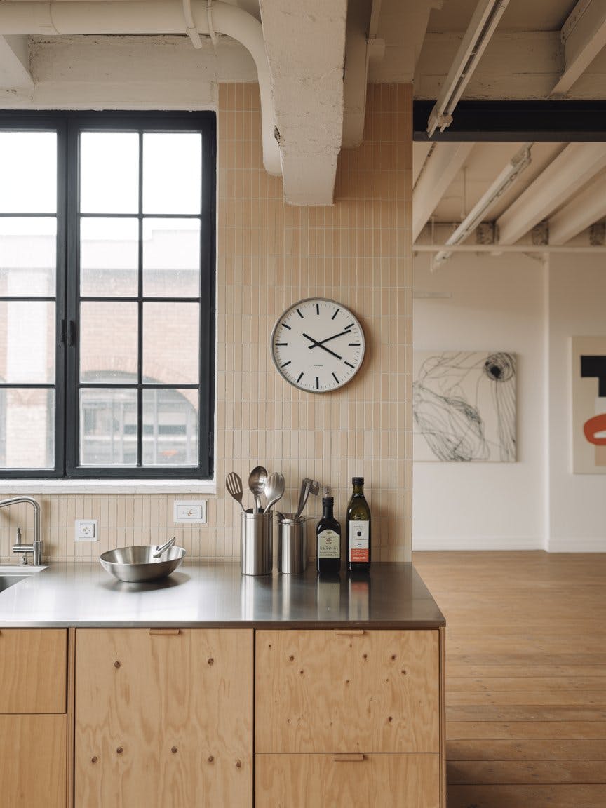 Modern industrial loft kitchen with utilitarian design and minimalist aesthetic