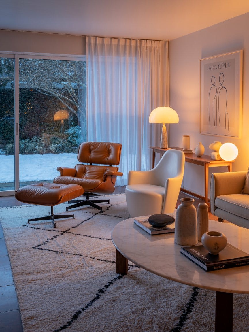 Mid-century aesthetic living room with ceramic decor in cozy winter