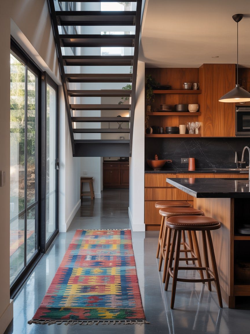 Modern industrial kitchen hallway, open-plan layout with high ceilings and black steel staircase