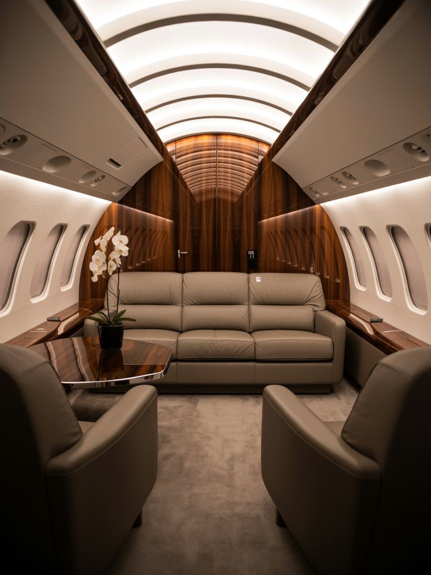 Luxury private jet interior with central wooden table and panoramic ceiling lights