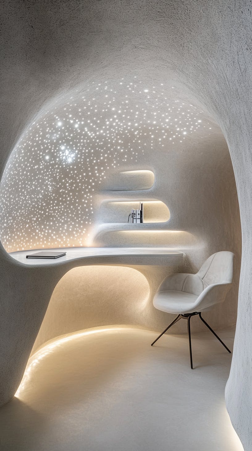 A cocoon-like study space curved in white shell with starlight perforations