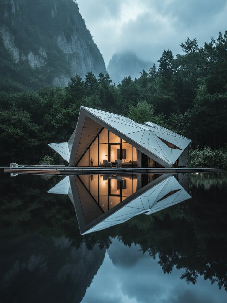 Futuristic geometric house with sharp angular roof design in the mountain