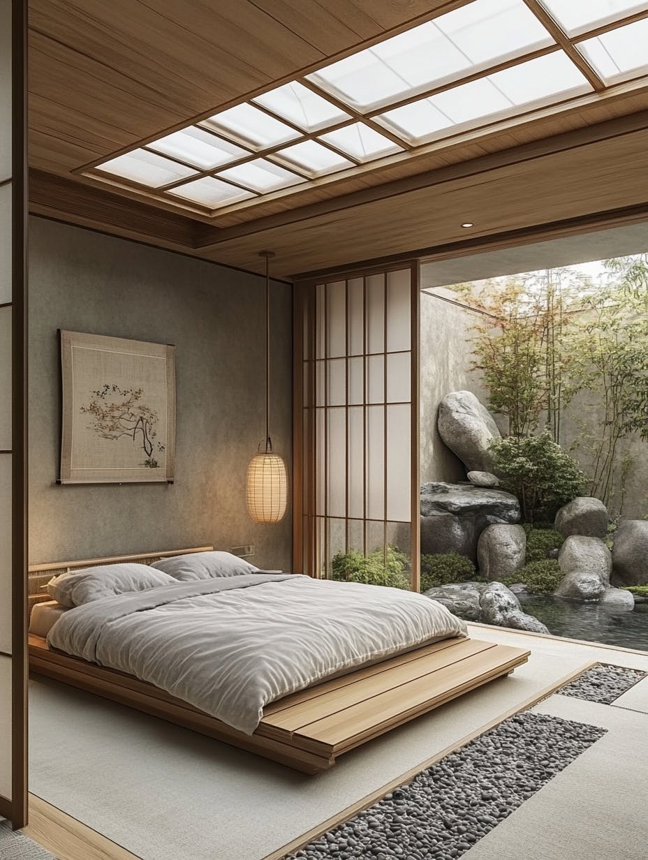 Zen-inspired bedroom with tatami flooring and low wooden platform bed