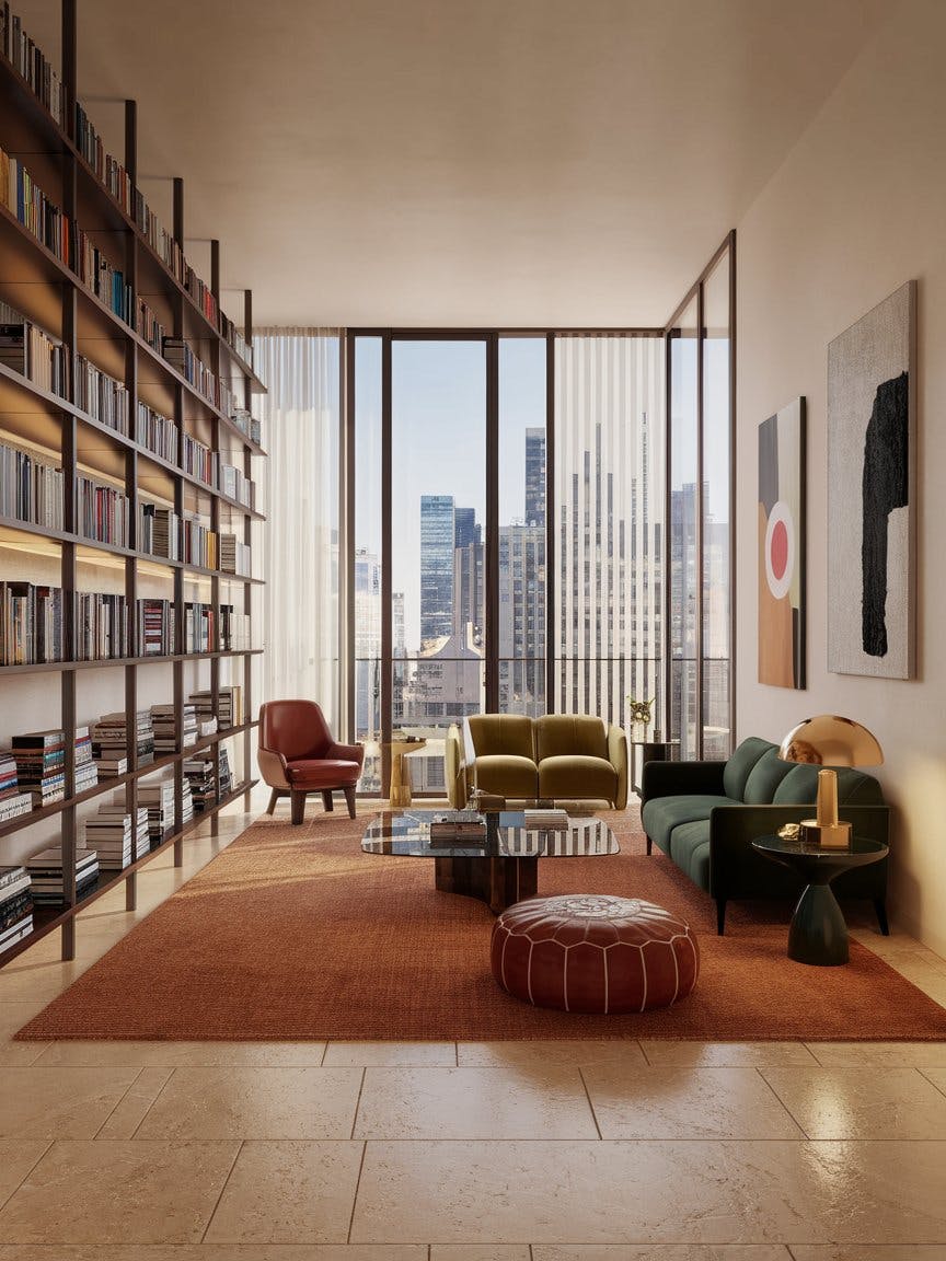 Modern city apartment interior with bookshelves and mid-century modern furniture