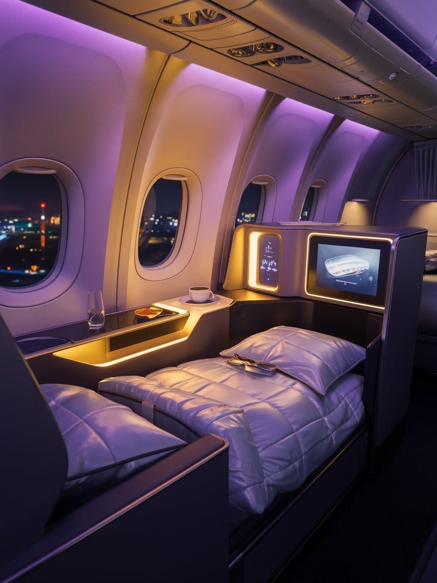 luxurious first-class airplane cabin in nighttime atmosphere with a minimalist design