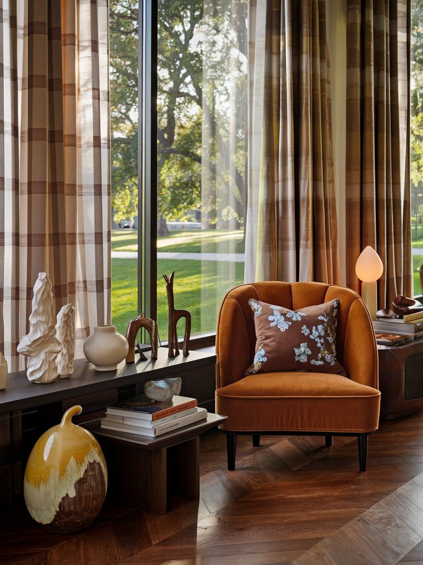 Cozy reading nook featuring fine-art decor with a green park view